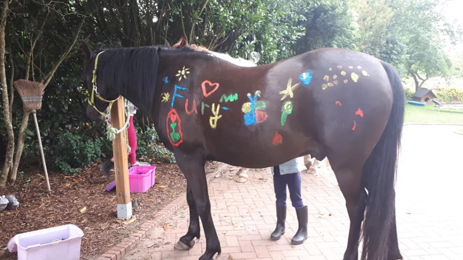 Es gibt bei uns keine typische Reitstunde. Mal gehen wir auf den Reitplatz, mal bleiben wir im Innenhof. Wir reiten aus, machen Bodenarbeit, malen die Pferde bunt an und zwischendrin darf es auch mal eine Theoriestunde sein.
